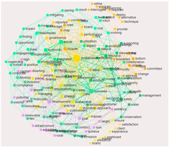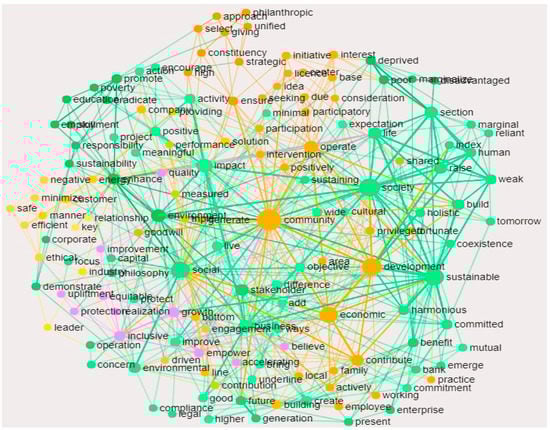 Text Network of the Conceptualization of Sustainability among Indian Companies. Legends: The size of the nodes depicts the degree centrality of the nodes, and the color shows different sub-networks or communities of text.