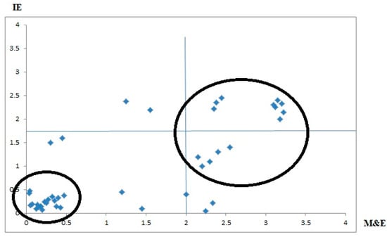 Figure 4 presents the grading of CSR policies in terms of having clear approaches and frameworks for overall M&E and specifically IE. Along with overall M&E, we also look at IE, as it is an important and distinct evaluation method with its own methodological challenges [51]. We reviewed the available evaluability assessment frameworks developed by Davies (2013) [52] and Holvoet et al. (2018) [53]. However, these frameworks present an elaborated methodology to assess program planning and monitoring and evaluation (M&E) systems in national and regional level institutions or large-scale development interventions. CSR policies. Therefore, we developed four distinct criteria to grade CSR policies for both M&E and IE (see Table 4). The analysis shows that out of 44 CSR policies, 22 did not even acknowledge adoption of M&E and/or IE systems and processes in their CSR operations (circled in the left corner at the bottom of the graph). Almost a similar number of policies mentioned that the in-house CSR committee would carry out the monitoring. Interestingly, members of the CSR committee often had industry backgrounds, and a lack M&E and social sector-related experience, while the committee’s chair was often the head of the human resource department or a senior level officer from the same department.