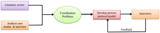 Literature in the field (e.g., [15]) indicates that development of the process maps requires a triangulation of several research approaches ranging from literature review, case studies and interviews to action research. Literature review and case analysis techniques are used to understand the current state of the art and problems related to coordination. The process model is developed taking these problems into account; in fact, the main function of the model was to provide a clear illustration of the processes. Finally, expert interviews were conducted to validate the developed process maps. The interviews in this stage were necessary to ensure the quality of the information that would be used to validate the developed maps. The methodology adopted to achieve the objective of this research consists of three main stages, as shown in Figure 1. The focus geographic region of the study is selected as Middle East and specifically Palestine as donor funding for public construction projects is very common. The literature review was focused on identifying the problems in the industry, and uncovering the details of the process protocol approach/methodology applied earlier. Furthermore, five real-life cases were analyzed by semi-structured interviews to understand the real-life processes and problems related to the coordination in donor-funded projects, and to develop proposed process protocol for overcoming these coordination problems. The questions used in the semi-structured expert interviews and the unstructured interviews done with real-life project participants were prepared based on the literature review conducted related to coordination problems in construction. As the information gathered would be qualitative in these techniques, the validity and reliability were ensured through an internal pilot. In addition, self-checking procedures are completed by all researchers to ensure the questions are easy to understand and non-biased. The review of legal documentation for these five projects was also conducted prior to the development of the process map. In the next stage of the research, a set of process maps were developed. The strategy used for validation of the process maps is explained in detail in Section 6. The strategy of the map validation included an interview with ten experts including engineers, contractors, and project managers, performed in a period of three months to validate the process maps and also to determine the role of a process model in improving the coordination in construction projects.