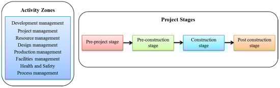 A process protocol is a tool and methodology for formalizing the process in the construction industry. The formalization of the processes serves for better understanding of the flow of events and interactions between the parties, finally resulting in better coordination during the design and construction stages. The approach has its roots in systems engineering and total quality management, where each molecular level component of a business is identified in detail. This identification includes the identification of the activities, actors that take part in this process, the input and outputs of the process, and identification of the relations between different processes, between super and sub processes. U.K. and U.S. institutions are the leading research bodies in this field. The U.K. construction industry process protocol is a well-known protocol and is based on a recognized process model. In the model, construction processes are grouped into four main stages: pre-project, pre-construction, construction and post-construction. In addition, the participants within the Process Protocol [15] are organized into activity zones (Figure 2).