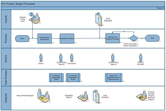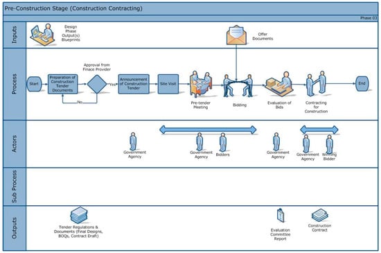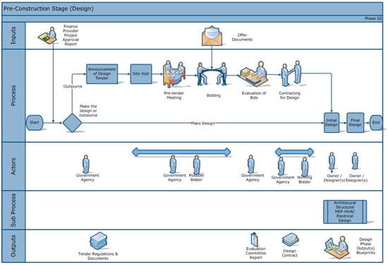 The proposed process map presented in this section was developed as a result of findings of the literature review, case studies and interviews. The map concentrates on the four phases of the (donor-funded) project lifecycle: pre-design, pre-construction, construction and post-construction. In Palestine (where donor-funded projects are common), public procurement law, International Federation of Consulting Engineers (FIDIC), and Consultant Working Manual are used as standard legal forms of contracts in construction projects which are signed with a goal of establishing fair balance between the rights and obligations of the owners and contractors. In fact, in the country, a clear definition of processes and construction management—based on standardized processes—has not been realized yet. This is due to insufficient project planning and management skills, and the weak documentation of information in most of the projects. Moreover, as most of projects are funded by donors, they impose their own methodology in managing the projects. According to the laws and government regulations, the construction projects in public sector in Palestine are funded by donors and owned/managed by a government institution. The model (and maps) presented below cover the processes of donor-funded projects. The model: (i) identifies the inputs required for each project stage; (ii) identifies the processes and sub-processes for that stage; (iii) identifies the actors who participate in each process; and (iv) determines the outcomes from each stage. The four phases of the overall construction process are defined as pre-design, pre-construction, construction and post-construction. The sub-sections below explain the details of the processes in these phases and present the process maps for each.