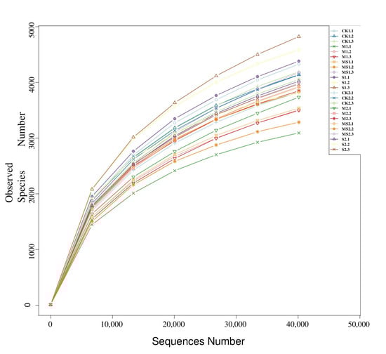 Rarefaction curve established on 97% similarity. CK1.1, CK1.2, and CK1.3 refer to control soil; M1.1, M1.2, and M1.3 represent the goat manure-amended soil; MS1.1, MS1.2, and MS1.3 represent the sugarcane straw and goat manure-amended soil; and S1.1, S1.2, and S1.3 represent the sugarcane straw amended soil in the first phase, respectively. Similarly, CK2.1, CK2.2, and CK2.3 refer to control soil; M2.1, M2.2, and M2.3 represent the goat manure-amended soil; MS2.1, MS2.2, and MS2.3 represent the sugarcane straw and goat manure-amended soil; and S2.1, S2.2, and S2.3 represent the sugarcane straw-amended soil in the first phase, respectively.