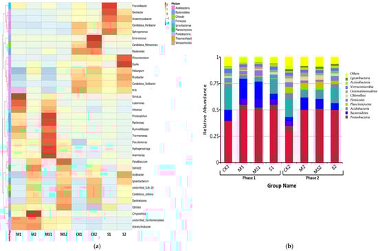 (a) Dispersal of the 35 highly dominant genera in a heat map. (b) Dispersal of top 10 highly dominant phyla in control soil (CK1), goat manure-amended soil (M1), goat manure and sugarcane-amended soil (MS1), and sugarcane-amended soil (S1) in the first phase. Similarly, dispersal of highly dominant genera and phyla in control soil (CK2), goat manure-amended soil (M2), goat manure and sugarcane-amended soil (MS2), and sugarcane-amended soil (S2) in the second phase.