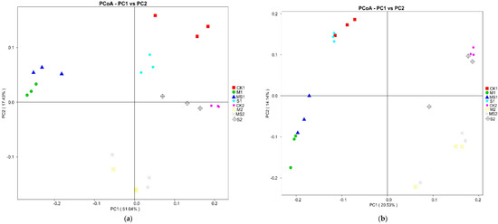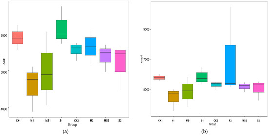 ACE and Chao1 estimation demonstrated that soil amended with M and MS (M1, MS1) showed lower bacterial community richness as compared to control and all other amended soils (CK1, S1), in the first phase, respectively (Figure 3a,b). However, during the second phase, M-amended (M2) soil showed higher bacterial community richness than all other amended and control soils (S2, MS2, and CK2), respectively, while diversity of Simpson including Shannon (SSD) indices declined in S- and M-amended soils (M1 and MS1) as compared to control (CK1) and S-amended soil (S1) during the first phase. Likewise, a significant decrease in the M2 and MS2, as compared to control soil (CK2) and S-amended soil (S2) during the second phase was recorded. From a diversity comparison among all amended soils in both phases, the SSD decreased significantly in M1, M2, MS1 and MS2, however, no significant differences were observed for S1, S2 across all the samples (Figure 3c,d). Both weighted (WT) on the basis of taxa abundance and un-weighted (UWT) based on sensitive to rare taxa UniFrac distance matrices were used to estimate the β-diversity among soil samples. From the WT UniFrac principal coordinate analysis (PCoA) during both phases, soils displayed that bacterial populations in control (CK1, CK2) and (S1, S2) were distinguished from (MS1, MS2) and (M1, M2). Clustering of M1, M2, and MS1 and MS2 was observed along axis-1, while the clustering of S1 and S2 was along axis-2. Furthermore, UWT UniFrac PCoA analysis demonstrated that bacterial populations in the CK1 and S1 were also differentiated from M1 and MS1, and their clustering was observed towards axis-1 in both phases while clustering of M2, S2, and MS2 was along axis-2 (Figure 4a,b).