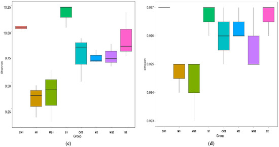 α-Diversity indices containing calculations of (a) ACE; (b) Chao1; (c) Shannon; and (d) Simpson in control soil (CK1), goat manure-amended soil (M1), goat manure and sugarcane straw-amended soil (MS1), sugarcane straw-amended soil (S1) in the first phase. Similarly, in control soil (CK2), goat manure-amended soil (M2), goat manure and sugarcan-amended soil (MS2), sugarcane-amended soil (S2) in the second phase.