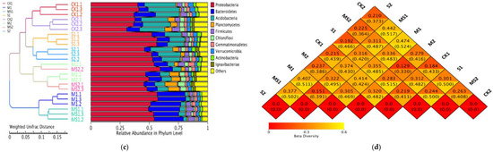 Biplot ordination of (a) principal coordinate analysis (PCoA) of weighted Unifrac and (b) unweighted UniFrac distances among various samples; (c) Based on weighted UniFrac distances UPGMA clustering analysis shows the relative abundance of the utmost abundant bacterial phylum in various amendments at different times; (d) Heat map of β-diversity based on unweighted (UUF) UniFrac and weighted (WUF) distances. Lower and upper corner values indicate the UUF and WUF distances.