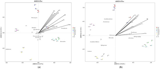 Distance-based redundancy analysis (dbRDA) relating phylum (a) and genera (b) to selected soil characteristics which are shown by the arrows. The lengths of these arrows shows the relative significance of measured variables, while the angle between the arrows and the axis reflects the degree to which they are correlated.