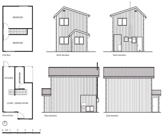 The thermal improvement from the minimum compliance of the standard’s demands is mainly characterized by the inclusion of insulation in the wall and roof elements along with the floor elements in contact with the ground (Table 2). The model home’s base structure was modified, respecting the essential materials that characterize it until meeting the standards demanded by the MINVU Technical Standard (NTM 11-2). In this sense, the top floor’s walls were modified to install 100 mm mineral wool. The thickness increase is made with a 1 × 2″ slat pine on the 2 × 3″ structure to reach the thickness needed to install the insulation.