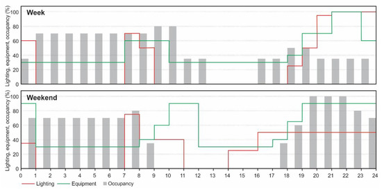 The model home used for the case study is a standard social home of 50.48 m2 spread over two levels. It is formed of a living room, a dining room, two bedrooms, a bathroom and a kitchen, and is located in Concepción, Chile (Figure 1). The initial characteristics considered for the home’s envelope can be seen in Table 2. The glazing system the model home has in its base case considers 6 mm simple glazing. The thermal loads associated to the electronic equipment were determined using the values established in the CCS in terms of percentage surface area in square meters that the home has (8.9 W/m2). The number of people to consider for the thermal loads associated to the occupation is given by the number of bedrooms. In this case, with two bedrooms, a total of three people is considered. The occupation loads, equipment and lighting calendars are established according to CCS [17] (Figure 2). The minimum ventilation forced extraction levels will be 5 renew/h [17]. The glazing system the model home has in its base case considers 6 mm simple glazing.