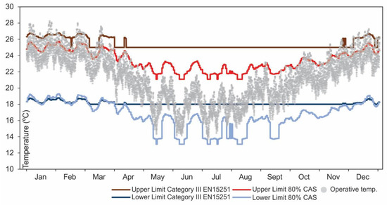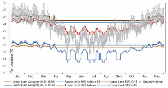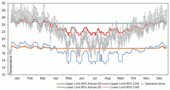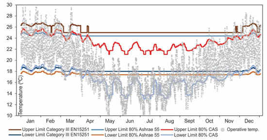 The CAS adaptive comfort model’s evaluation is made based on the comfort demands using the Table 6 equations. The assessment of the temperatures under this model is valid for buildings used for human occupation with sedentary activities and metabolic values in a 1.0 to 1.3 range, just as in the EN and ASHRAE standards’ model. Again, the space must have easy access to operable windows with the occupants being able to freely adapt their clothing to the external and/or internal thermal conditions. For its application, the average operation temperature, Ɵrm, must be between 5 and 12 °C (Table 6).