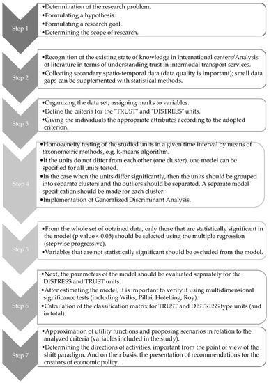 There have not yet been any studies in which the paradigm shift in freight transport (especially intermodal transport) was examined in relation to the trust modeling. It should be pointed out that the presented approach is quite generalized, hence, it can only be treated as preliminary research, introducing deeper analyses. The presented approach is consistent with the concept presented in the White Paper. It is not easy to discuss the variables and research techniques used, because, in principle, the methodology was not proposed using the example of intermodal transport for long distances. On the one hand, it addressed implementing the needs of the economy and supporting other modes of transport, and, on the other hand, it was oriented on trust in the sense of implementing the paradigm shift. The authors have made every effort to fill this research gap and present a kind of novelty in terms of the methods used. The work mainly uses General Discrimination Analysis, which can be used to decide on the selection of trust-oriented or distress-oriented units. There are various studies where this method is used, for example: Zioło, Porada-Rochoń, and Szaruga [51]; Safo and Ahn [52]; Chen and Jiang [53], or Dai and Li [54]. However, these studies were applied to completely different issues. The presented approach is aimed at introducing such a significant discussion as though proposing a toolkit for assessing rather soft aspects, such as trust and distress, in the sense of the paradigm shift for transport. Therefore, the study of the modal shift potential of long-distance road freight in containers seems to be quite interesting in this context. The proposed approaches of the above researchers have led the authors to combine these aspects into one study.