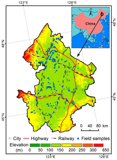 The West Songnen Plain is located in the central part of Northeast China, extending from 44° N to 48°33’ N and from 121°38’ E to 126°38’ E, and covering 22 counties, with a total area of 1.02 × 105 km2 (Figure 1). The study area is characterized by a temperate, semiarid, continental monsoon climate. Air temperature spatially increases from north to south, with a mean annual value of 3.6 °C when summer is warm and winter is cold. Annual precipitation varies remarkably from 350 to 650 mm, while mean potential evapotranspiration is 1100 mm. Over the past decades, WSNP experienced significant increases in air temperatures and dryness, and decreased precipitation []. Changing hydrological regimes affects the wetland systems []. WSNP is a typical ecotone between agriculture and pasture in northern China, and is ecologically sensitive to human activities and climate change. Excluding extensive croplands, dominant natural land cover is grasslands and wetlands. Dominant soil types are chernozem, chestnut soil, meadow soil, and aeolian soil []. Major rivers, including Songhuajiang, Nenjiang, and Taoerhe, flow through this region, while many lakes and reservoirs, including the largest Chaganhu Lake and Nierji Reservoir, are sparsely distributed in the study area. Large areas of wetlands were thus observed in the study area.