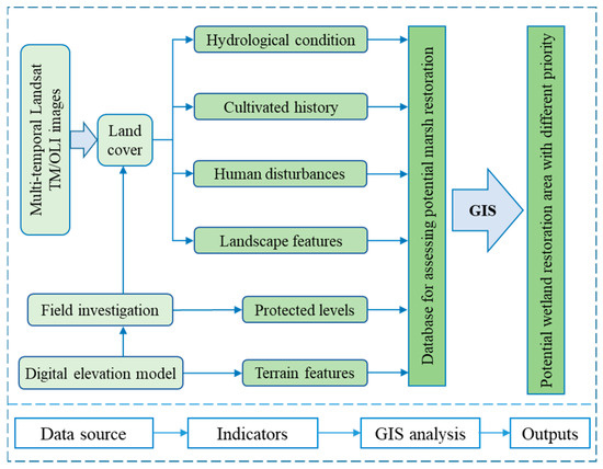 Previous studies also indicated that remote sensing (RS) and geographic information systems (GIS) were important data sources and tools in supporting spatial decisions for wetland restoration [,]. RS can characterize the current situation of the land surface, and also provide historical data contributing to the assessment of restoration suitability []. With GIS software, much spatial analysis can be performed, such as overlay and buffer analyses. Therefore, by selecting suitable indicators and designing scientific criteria based on both RS and GIS technologies, identifying potential areas for wetland restoration is feasible.