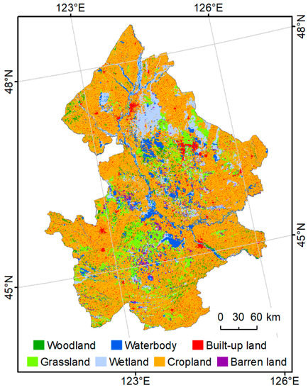In this study, the land cover was categorized into seven types, namely, woodland, grassland, wetland, waterbody, cropland, built-up land, and bare land, as shown in Table 1. Particularly, we separated “waterbody” from “wetland” in this study to document the hydrological conditions. “Wetland” in our study refers only to marsh, which is the only wetland type covered by vegetation. “Cropland” is also classified as two types: dry farmlands and paddy fields. In May and June, these two types are easily distinguishable from satellite images due to the use of irrigation in paddy fields.