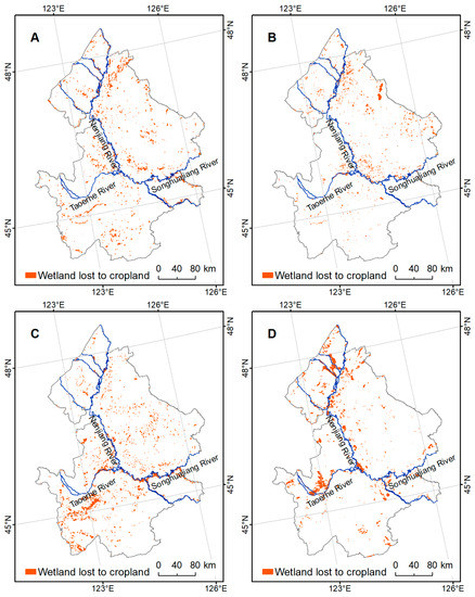 Distribution of wetlands lost to croplands in West Songnen Plain: (A) 2010–2015; (B) 2005–2010; (C) 2000–2005; (D) 1990–2000.