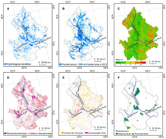 Spatial pattern of indicators for wetland restoration: (A) hydrological condition in 2015; (B) flooded area in 1998 and 2013; (C) land slope; (D) human disturbance; (E) isolated cropland; (F) protected area.