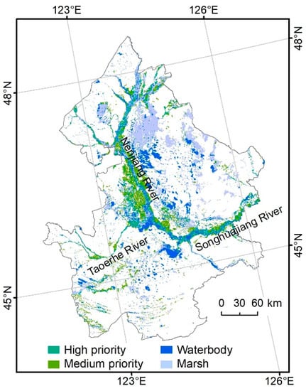 The West Songnen Plain (WSNP), located in central Northeast China, is an important geographic region because of its role in protecting biodiversity, providing critical habitat for migrating waterfowls, and regulating regional climate []. However, WSNP was also identified as a hotspot area of wetland loss in several studies []. Wang et al. [] revealed that WSNP experienced considerable shrinkage and fragmentation of wetlands from the 1950s to 2008, which can be mostly attributed to agricultural encroachment and a drier climate. In the recent decades, another study [] also documented that the extensive loss of wetlands over the WSNP was largely related to cropland expansion during 1990–2010. The areal decline in wetlands has caused obvious ecological consequences, such as loss of the habitat of the red-crowned crane and the white crane, and decreased capacity in abating floods. Although the importance of wetlands in the WSNP have been recognized by China’s central and local governments, and wetland restoration projects have been performed in some plots since the 1990s [], policies for grain production and ecological security are still conflicting factors. In response to these ecological issues, and in the pursuit of a balance between food demand and ecological conservation, we should know how many wetlands there are, and which ones can be restored from croplands in the WSNP. But such information is limited. A spatially explicit map for potential area and priority of wetland restoration for the WSNP is unavailable; this is urgently needed for regional sustainable ecosystem management.