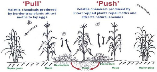 In the PPT strategy, a cereal crop such as maize is intercropped with a stemborer moth repellent fodder legume, Desmodium (the push), together with an attractant trap plant, Napier/Brachiaria grass (the pull), planted around the maize–legume intercrop (Figure 1). The green leaf volatiles produced by Desmodium repel stemborer moths while those produced by the trap grasses attract them [40]. In addition, Napier or Brachiaria grasses greatly reduce the development of the stemborer larvae and hence the majority of them die before reaching adulthood [50]. Desmodium root exudates also suppress and eliminate Striga, leading to significantly enhanced maize/cereal yields [51]. Studies have identified the mechanisms by which Desmodium suppresses Striga, with an allelopathic effect being the most important one [52]. Desmodium roots produce a blend of chemical compounds, some of which stimulate Striga seeds to germinate while others inhibit lateral growth of Striga roots, thereby hindering their attachment to maize roots, i.e., suicidal germination [52,53,54]. Striga emergence is thus suppressed, with an in situ reduction of the Striga soil seed bank]. In addition, the PPT is beneficial in crop–livestock integration through fodder provision (by the grass and legume companion plants), soil improvement, agro-ecosystems resilience through crop intensification, income generation and meeting food security demands of smallholder farmers [55]. Currently about 200,000 farmers are practicing the PPT in East Africa [56]. Although the PPT concurrently addresses both the Striga weed and stemborer pests, Striga was not considered as a serious threat by the farmers in the study areas. The PPT implementation (Table 1) was undertaken on these areas where stemborer pests was identified as the most challenging in maize crop production constraint.