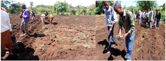 Several efforts have been made in Ethiopia to bridge the research–practice gap through the introduction of new technologies [74]. However, in a situation where there are different levels of participation and the farmers are at the receiving end, whereas the researchers and extension professional are controlling resources for technology implementation, it is not easy to eliminate such a gap [74,75]. With such type of relationship, the farmers believe that, whenever these technologies are introduced, their participation is limited to following and adhering to instructions provided [75]. Under such circumstances, farmers’ trust is low whenever new initiatives are introduced by the people whom they believe to have a hidden agenda or acting on behalf “state authorities or other agencies”. However, in a situation where there are efforts to build trust in a democratic atmosphere, this is empowerment; the farmers are able to take new technologies with the seriousness they deserve. For example, the sustainability of the PPT is not only dependent on its effective performance in the control of stemborer pests, but also on market forces from the demand and supply of Desmodium and Brachiaria seeds and other inputs. In addition, it is dependent on leadership initiatives from the micro level, i.e., at the household level where the head ensures that all members of the household participate and their capacities are built with the PPT-based knowledge. The farmers can organize and allocate their farm families in terms of roles and responsibilities on carrying out the PPT activities. The PPT was implemented as an enterprise where the different family members were empowered to exploit the various benefits and opportunities which come with it, e.g., from Desmodium and Brachiaria seed production, process and marketing as a source of income generation of livestock fodder for milk production. This was also in anticipation that one of the family members is incapacitated or moves on to other activities, and the rest of the family members can continue with the technology implementation. This sort of leadership at family level was built from the confidence derived by the farmers, whereby their role is recognized by both research and extension professionals. The farmers’ leadership was demonstrated by their ability to initiate, conduct experiments and take decisions with confidence regarding the PPT implementation activities. For example, researchers recommend the establishment of the PPT using line planting where the seeds are sown in holes or drills using a straight line. However, the farmers preferred to use ox-drawn ploughs to drill the lines (Figure 4). These lines were not straight as required or recommended by the research or extension, but the farmers, thriving in a participatory and democratic learning process, could make decisions based on valid reasons on what they knew works best for them. This was different from previous relationships where they were dictated by the Development Agents (DAs) or local administration and researchers on what to do during on-farm trials or implementation of new technologies. This time, they could use their own measurements and tools: