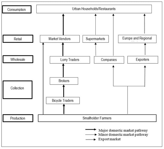 Different tools were used for data collection. A structured and pretested questionnaire (for face-to-face interviews) consisting of both open- and closed-ended questions was administered to producers and retailers, while checklists (sets of few open-ended questions) were used to gather information from key informants [including market masters, collectors (bicycle traders and brokers), and wholesalers]. Four enumerators were hired and trained specifically for this study. Prior to the interviews, each respondent was informed about the purpose of the study and the context in which the interview was to be conducted. Respondents were told that their participation is voluntary and their responses will be kept strictly confidential. Consent was sought for each respondent before participation, and each was informed to discontinue participation at any time if chosen so. Finally, each respondent was reminded that there were no right or wrong answers and that the interviewers were only interested in their opinions. During the interview, each question was described carefully, simply, and thoroughly to ensure that the respondents understood the questions asked. A household head (male or female) was interviewed for each selected farming household, while a trader (male or female) was interviewed at other value chain nodes. All of the interviews were conducted in local languages. Responses were checked daily by a supervisor to ensure accuracy, consistency, and completeness.