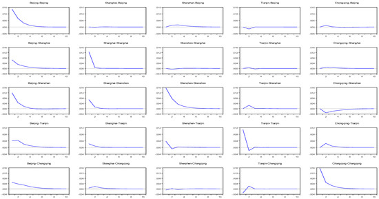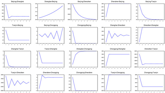 In Table 3, VAR models of city pairs are presented to show interaction between cities. Because we used house price return data of five cities, ten VAR models are displayed. In terms of correlation between return rates, the results in Table 3 are much higher than those in Table 2. Only two city combinations had no significant correlation between returns, namely Beijing & Shenzhen and Shanghai & Shenzhen. We illustrated the impulse-response function estimated based on Table 3 in Figure 2 and found that the impulse influences in Figure 2 were greater than those in Figure 1. However, Table 3 does not cover correlations of volatility. Table 4 presents the estimation results obtained using the VAR–MGARCH model (Equations (1)–(3)) to provide a more comprehensive analysis. Except for Shanghai & Shenzhen and Shenzhen & Chongqing, lead-lag relationships existed in all city pairs. In other words, a return spread effect existed. Specifically, house price returns in Beijing influenced those in Shanghai and Shenzhen and were influenced by those in Tianjin and Chongqing. House price returns in Shanghai and Shenzhen influenced those in Tianjin, those in Tianjin influenced those in Chongqing, and those in Chongqing reversely influenced those in Shanghai. These relationships suggested that among the first-tier cities, Beijing was the source of influence for Shanghai and Shenzhen. Shanghai and Shenzhen mainly influenced the second-tier city Tianjin, which further influence Chongqing, and through the latter, the influence was transferred back to Beijing and Shanghai.
