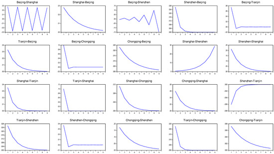 The aforementioned notable lead-lag relationships indicated that the analyzed cities may also transfer risk among themselves. From the estimation results of the volatility matrix presented in Table 4, regardless of whether a lead-lag relationship existed between paired cities, all pairs achieved significant correlation in terms of volatility. The estimation results revealed that several of the correlation functions had all their volatility-related coefficients (i.e., , , , , , or ) achieving significance, and some of the functions had at least one of the coefficients achieving significance. The VIRF obtained based on Table 3 is illustrated in Figure 3. The figure shows that the influences of volatility between paired cities were all positive. In other words, impulses in the housing market of one city result in increases in the housing market of another city. However, these influences can be divided into two types. The first type causes volatility that increases over time, whereas the second type causes volatility that decreases over time. In other words, Type 1 influences are those that scale up a crisis when transferring risk from one market to another, whereas Type 2 influences are those that temporarily increase risk during such transfers, and the influences are undermined over time. The most prominent example of a Type 1 influence was the transference of impulses from Shanghai’s housing market to Beijing’s housing market.