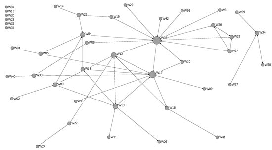 The questionnaire included questions related to the type of wines produced, target markets, involvement with institutions, innovation-related processes, and performance at the firm level. Complementing this, it also included a group of questions aimed at mapping the relational activity of the wineries in the cluster. More concretely, we opted for the so-called Roster-Recall method [] to obtain the data to build the cluster collaborative network. Methodological considerations [,] and previous research [,,,] make this strategy extremely advisable. With this method, each firm is confronted with a complete list of the wine producers of the cluster and is asked to specify from whom they received or transferred market or technical advice. In particular, they were asked the following two questions: (a) From which of the wineries on the list have you regularly asked for technical information during the last three years? (b) From which of the wineries on the list have you regularly received requests for technical information during the last three years? On the other hand, respondents were also invited to add any other wineries with whom they had contact but did not appear on the list. Relational data were arranged in a square data matrix in which cell ij was coded “1” when the winery i reported a knowledge transfer to the winery j. Thus, the relational data captured enabled a reliable reconstruction of the cluster knowledge network through directional links between the different wine producers of the cluster.