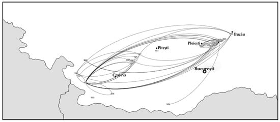 Complementing and confirming the results obtained by the quantitative data, the map below (Figure 2) graphically shows the geographical distribution of links between the different wineries and sub-regions in the Multenia-Oltenia wine cluster for the knowledge network.
