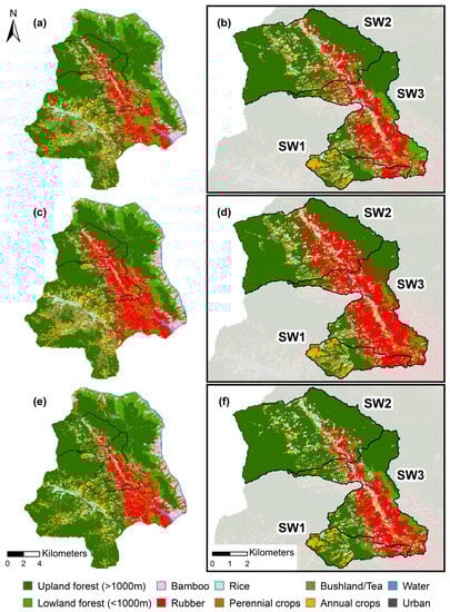 The scenarios used for this study were developed as part of the Chinese–German project SURUMER (Sustainable Rubber Cultivation in the Mekong Region) [36]. The project had the objective to develop sustainable land use strategies for rubber cultivation through a close interaction of science and practice [37]. A team of relevant stakeholders in collaboration with a multidisciplinary team of scientists developed several future land use scenarios [38]. We used two of these scenarios to assess potential TPs in the supply of ESS in the research area: (1) The Business-As-Usual scenario (BAU) and (2) the Balanced-Trade-Offs scenario (BTO). In BAU, past rubber expansion in Xishuangbanna [39] and the Nabanhe Reserve [28] was linearly continued at an annual rate of 2%, independent of the suitability of the land. In BTO, rubber expansion was restricted to areas suitable for rubber cultivation. These were defined as below 900 m.a.s.l. and with slopes below 23°. These restrictions were chosen based on reduced rubber yields at high altitudes [40] and the aim to reduce soil erosion on sloping areas [27]. BTO additionally included the establishment of riverine buffer zones around the main rivers in Nabanhe Reserve. These consist of secondary forest vegetation and are 30 m wide. Similar reforestation measures were introduced in the initial years of BTO as water protection zones around water sources for domestic use. The land use map of 2015 (Figure 1a) served as the initial condition for both scenarios. The scenarios have been described in more detail in Thellmann et al. [41]. Land use changes were simulated for 25 years, from 2015 to 2040. The focus in Thellmann et al. [41] was on deriving realistic land use change scenarios and information on ESS preferences and evaluation through a close interaction with stakeholders. Here, we refrained from social or economic valuation for ESS and focused on analyzing the biophysical changes in ESS supply for two contrasting land use scenarios across varying spatial scales and initial land use conditions. Figure 1c–f shows the spatial extent of land use changes introduced in both scenarios for the final year of the simulation (2040).