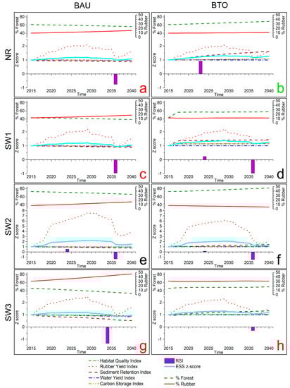 Depiction of the modeled and normalized ecosystem services (ESS) indices for Habitat Quality, Rubber Yield, Sediment Retention, Water Yield, and Carbon Storage, as well as their annual arithmetic mean value (z-score) for the Business-As-Usual (BAU) scenario (left column; (a,c,e,g)) and the Balanced-Trade-Offs (BTO) scenario (right column; (b,d,f,h)) in relation to rubber-related land cover changes throughout the simulation period between 2015 and 2040. The rows of graphs relate to the whole Nabanhe Reserve (a,b), SW1 (c,d), SW2 (e,f), and SW3 (g,h). The land use changes are given in percent of the extent of the Nabanhe Reserve or respective subwatershed for each graph. Years with potential regime shifts are indicated by purple columns (RSI: regime shift index). Note the different scaling on the y-axis for the z-score of the different subwatersheds and the differences in scaling on the axes for rubber and forest coverage. The coloring of the letters (a–h) indicates if the regime of ESS supply at the end of the scenario is comparatively better (green), worse (red), or approximately the same (black) as the initial condition.
