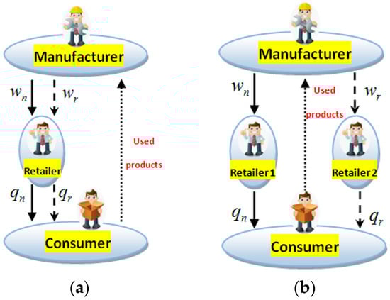 As per Savaskan [28], the authors assume the previous existence of the product in the market, which can then be returned to the manufacturer for reuse. The authors emphasize that all decisions are considered in a single-period setting: The manufacturer sets the wholesale price for both products (wn/wr) and then the retailer(s) responds with the optimal units of qn/qr. Note that all decisions being made in a single-period enables the authors to focus on steady-state profits, facilitating analytical tractability in this model and contributing to the solution of the problems [28,29,30,31].
