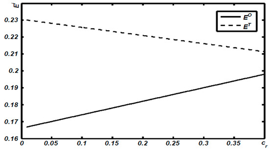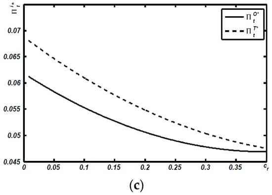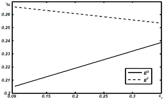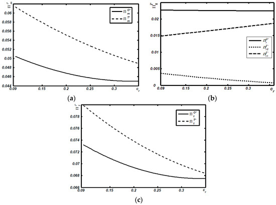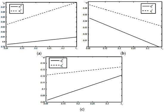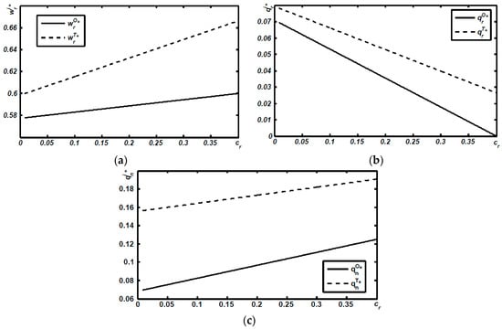 Note that the potential market size is normalized to 1 in this study, thus, like Esenduran [44] and Yan [23], all parameter values need to be normalized, such as . The consumer value discount for remanufactured products is represented by . To ensure , the authors set in Lemma 3, for the numerical examples, 0.0083 < cr < 0.4. We conduct the numerical simulation using Matlab 2014 to obtain all figures, which describes how cr impacts the difference in equilibrium decisions, such as optimal quantities and wholesale prices (see Figure 6), and highlights the results of economic (see Figure 7) and environmental outcomes (see Figure 8).