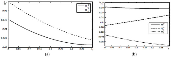 Finally, Figure 5 and Figure 8 show the environmental impacts for both models. The environmental impact in Model T is always higher than that in Model O, meaning that Model T will cause a stronger environmental disruption than Model O. As Proposition 6 shows, Model O is always greener than Model T. Furthermore, it can be found that, in Model T, the level of environmental impact decreases with the remanufacturing cost, . Quite the opposite, in Model O, the level of environmental impact increases with the remanufacturing cost, .