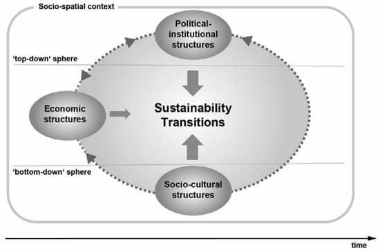 As an important step towards a broader understanding and analysis of urban sustainability transitions, we suggest an analysis of pre-existing structures within sustainability transition pathways [13,117,118]. Socio-technical transition processes usually happen over several decades. Changes in the sustainability context may occur faster. Considering the distinctive normative nature of sustainability transitions, the speed and the directions of change are often explained by society-driven ‘bottom-up’ or/and policy-driven ‘top-down’ activities. Geels [50] suggested that policy-making processes especially need a closer examination in their function as drivers or detractors of sustainability transitions. Therefore, the MLP understanding of niches as the most important level and generally as seedbed of technological innovation seems to be increasingly unsuitable for sustainability transition research.
