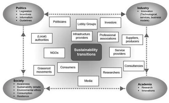 The heterogeneous field of actors in urban sustainability transitions is receiving more attention. Understanding the interplay of actors from public, private, and academic sectors is a key analytic object in transition research (see Figure 5). It is widely accepted that actors (individual and collective) play an important role when interacting with economic structures and also with the political and institutional context in innovation processes. Actors in city contexts can play a key role as catalysts for new practices, technologies and new narratives [132]. Thus, there is an increasing number of publications focusing on actors and actor networks in urban sustainability transitions [1,91,106].