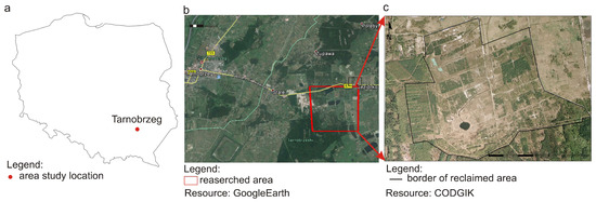 Research area location on map of Poland (a) and reclaimed and reforested area border (b,c).