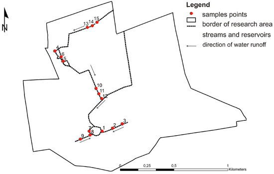 Samples of surface water were collected from 15 monitoring points on reservoirs and watercourses (Figure 2) in summer, autumn, winter, and spring. The water samples were analyzed for pH, EC, and ionic content (Ca2+ Mg2+, Na+, NO3−, SO42−, Cl−, HCO3−) on a Dionex Ion Chromatography 5000 apparatus [18,19]. The spatial variability of ionic content and hydrogeochemical classification were assessed according to Szczukariew–Prikłoński classification [20].
