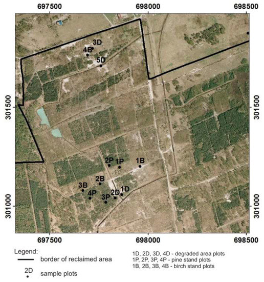 Based on GPS measurements, the exact position of the research sites was determined, and data was collected to make a photo-interpretation key (geotagging of photographs). After determining land-cover classes (orthophoto screen vectorization in the ArcMap ArcGIS 10.2, Esri program [14]), patches of microhabitats were selected in three categories (Figure 3), i.e., an effectively reclaimed and forested site category (pine P and birch B stands, four plots each), and a degraded D stand with little herbaceous vegetation cover and occasional trees from natural succession (four plots). Detailed research was conducted on 0.01-ha (r = 5.64 m) circular study plots, from which composite soil samples were collected from a 0–5 cm and 5–40 cm horizon (sampling at five points arranged in a regular pattern: one point in the middle, and four in the corners of the square, as inscribed in the circular study plots). Next, pH, EC, ST, SOC, and NT were analyzed in the samples, according to standard methodology (described previously). The degree of herbaceous plant cover on study plots was determined using the Braun–Blanquet scale, and an inventory of the existing trees was made. DBH and height Ht were measured in case of trees.