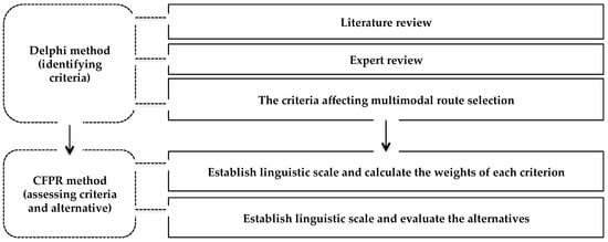 The process initially employed the Delphi method to obtain a hierarchy of factors affecting multimodal route selection and alternative routes from Shenzhen to Hai Phong. The second step subsequently applied the CFPR method to evaluate those factors and alternatives. During the initial Delphi phase, factors for discussion were suggested in the literature, and through open-ended questions to and brainstorming with experts, both shippers and LSPs involved with the routes, where LSPs no longer simply offer services demanded by shippers [50]: they serve as specialists to maximize the supply chain’s efficiency [51]. The main factors and sub-factors in the experts’ knowledge were weighted on a linguistics scale, and the alternative routes were then compared to determine the optimal option.