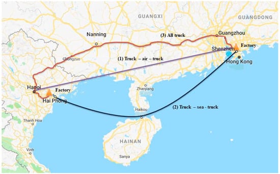 Truck–air–truck (factory in Shenzhen–Bao An airport–Noi Bai airport–factory in Hai Phong).