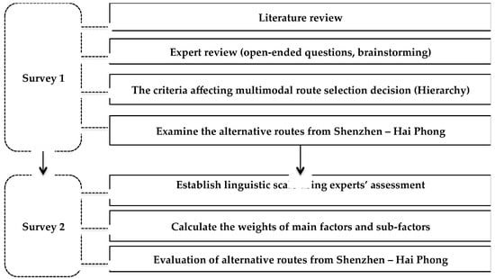 Some studies that have reviewed and assessed the performance of transport corridors have focused on Northeast and Central Asia [4] and Southeast Asia and east–west economic corridors [5]; however, few studies have evaluated the north–south economic corridor. Only scant research has focused on route analysis of electronic components from China to Vietnam. Therefore, the present study aimed to assess the competitiveness of transport routes by examining the decision-making process for selecting routes for electronics products from China to Vietnam through an empirical study of door-to-door transport from Shenzhen (China) to Hai Phong (Vietnam). The problem was solved using real data to assess the logistics service providers (LSPs) and shippers, who take leading roles in deciding route selection. The Delphi method and the Consistent Fuzzy Preference Relations (CFPR) method are employed to achieve the objective. As a result, crucial academic and practical implications are presented.
