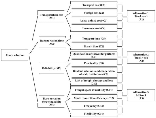 Other studies used mathematical formulae to consider additional expenses and other factors in transport choice, such as inventory and in-transit costs. In one study, 36 freight alternatives from China to India were evaluated, and the most competitive routes were identified by minimizing total distribution cost, total transit time, and transit time variability using a cost model and a goal programming model [12]. In addition, binary choice models have been used to examine the differences between trucks and railways for transporting cargo in the US [13]. Shipment-specific variables, such as distance, weight, and value, and mode-specific variables, such as haul time and cost, are influential factors affecting truck and rail competition. The real total costs for a Korean auto-parts company transporting goods from Korea to the US have been investigated using the inventory theory model [14], and a mixed-integer linear programming model for route selection, based on minimizing total energy consumption, has also been proposed [15].