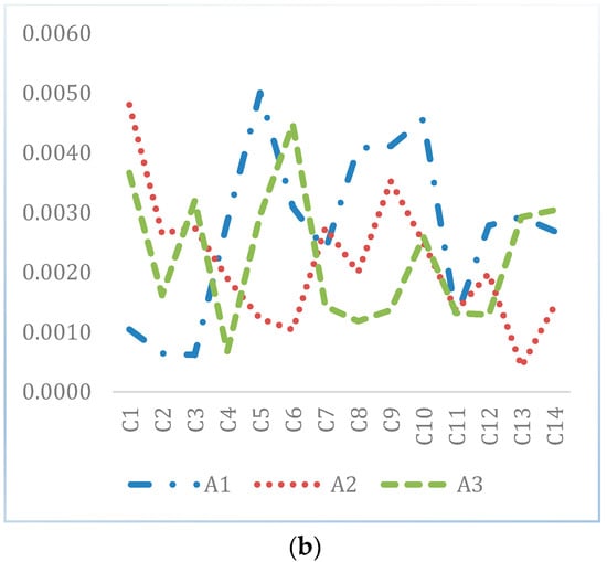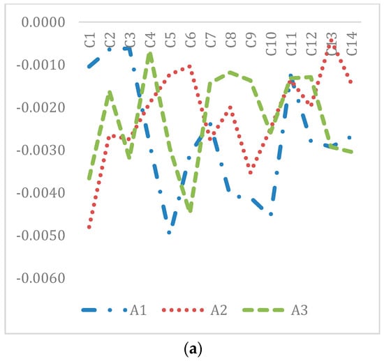 Sensitivity analysis was conducted by increasing and decreasing the priority weights of each route with respect to each factor and by equally decreasing and increasing the others’ weights, respectively. Figure 5 presents the results corresponding to each of the 14 sub-factors and illustrates the differences with respect to weighted scores for each alternative route by increasing and decreasing the weights of the sub-factors by 10%.