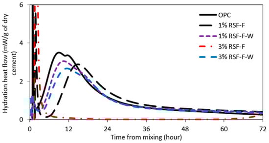 Isothermal heat of hydration of samples containing RSF-C and RSF-F are shown in Figure 2 and Figure 3, respectively. Addition of RSF prolonged the induction period. The higher the amount of RSF in the system, the longer the induction period would be. As can be seen in Figure 2, paste samples containing 1% of RSF-C showed a small increase in induction period. However, the induction period for samples with 3% RSF-F was around 70 h. It was also found that RSF-F had a more noticeable effect on retardation compared to RSF-C. For example, comparing the induction period of paste samples containing 3% RSF-C (Figure 2) with those of 3% RSF-F (Figure 3), one can see that samples with RSF-F have a much longer induction period (almost 60 h longer). Samples containing 1% RSF-C had negligible impact on retardation time; nevertheless, adding 1% of RSF-F to paste samples increased the induction period by about 5 h compared to the control sample (OPC). This could be because RSF-F is finer than RSF-C; a higher amount of inorganic impurities (such as Na and K) and organic contents (such as hemicellulose) could be leached out of RSF-F into the pore solution which could lead to longer dormant period. It is well known that the induction period increases as the organic compounds increase in pore solution [18].