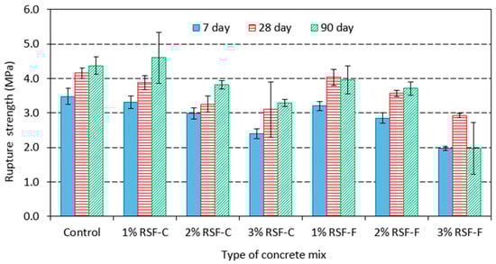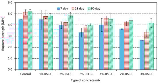Figure 8 and Figure 9 show rapture strength (flexural strength) of concrete samples with w/c of 0.42 and 0.54, respectively. For a given w/c, samples containing either RSF-C or RSF-F showed lower rupture strength compared to controls samples. Concrete samples containing RSF-F showed a lower flexural strength compared to those containing RSF-C; the opposite was true for compressive strength (see Figure 4 and Figure 5). Figure 8 and Figure 9 also indicate that flexural strength of concrete samples reduced as the percentage of RSF in concrete increased.