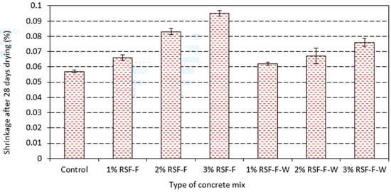 Figure 12 and Figure 13 compare drying shrinkage of samples containing washed and unwashed RSF. As can be seen, for both RSF-F and RSF-C, washing reduced drying shrinkage. Nonetheless, control samples still had the lowest drying shrinkage.