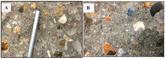 Cross section of concrete beams with w/c = 0.42; (A) control sample; (B) sample with 2% RSF-F.