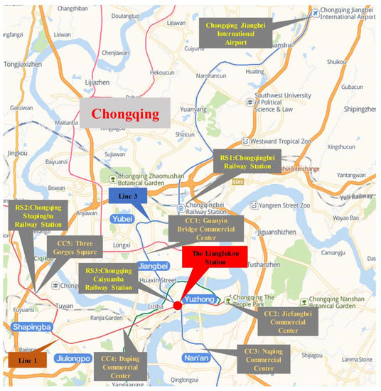 The Chongqing Lianglukou rail transit station was selected as the study case. The Chongqing rail transit developed quickly over recent years. Until December 2017, a total of six lines were in operation, incorporating 155 stations and 13 transfer stations. The operation mileage reached 264.3 km and ranked first in midwest China [55]. In the 13 transfer stations, the Lianglukou rail transit station is the transfer station of Line 1 and Line 3. Due to the multi-floor complex structure of the Lianglukou station, it was selected as the study case. Besides, another important reason for the selection was that extreme large volumes of transfer passengers are present in the station due to some distinctive stations occupying Line 1 and Line 3, including five commercial centers (CC1–CC5), three railway stations (RS1–RS3), and the airport of Chongqing, as shown in Figure 1. According to the statistics, the average daily transfer passenger volume is nearly 170,000. The extremely large transfer passenger volumes result in a much higher density of passengers in the constrained space of the station [56]. The safe operation of the station deserves much attention.