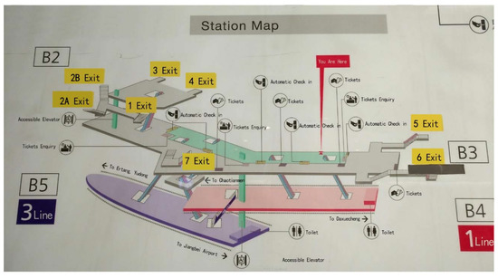 Field investigation and complex network analysis were employed in this study for passenger volume statistics and key nodes identification. Field investigation has been recognized as a useful method in many studies for field data collection [45,46,47]. Thus, in this study, field investigation was firstly implemented to clarify the structure of the station, to obtain the passenger flow features, passenger aggregation nodes in every floor, and the corresponding passenger volumes. Secondly, the complex networks of every floor were established and the key nodes were identified through complex network analysis. The complex network analysis presents two advantages. On the one hand, the utilization of this method was based on the contents obtained from the field investigation, including the structure of the station, the passenger aggregation nodes in every floor, and passenger flow features in the station. Thus, the implementation of this method was based on the objective information of the station. On the other hand, the connection and interaction abilities of the nodes were judged through centrality analysis for the nodes, and the centrality was sorted according to the degree centrality and betweenness centrality calculation results. Therefore, the judgement for the connection and interaction abilities was in accordance with accurate mathematical calculation. Some other methods have also been adopted in the analysis of passenger flow features and key nodes determination in indoor environment, mainly including field observation [45], video observation [48], interview [49], social force model [50], and cellular automata (CA) model [51], etc. These methods were useful for the studies. However, defects were presented as compared with complex networks and their inapplicability was shown for this study. The utilization of the methods of field observation, video observation, and interview are based on subjective judgment, and then the description for the passenger flow features and relationships among different nodes is generally based on qualitative analysis [52,53]. The above illustration for the complex network emphasizes two advantages, which are objective information and accurate mathematical calculation. Thus, compared with subjective judgment and qualitative analysis of the previous three methods, complex network analysis presents more objective qualities and accuracy. Besides, the methods social force model and cellular automata (CA) model were initially applied in the field of evacuation [50,54]. Even though some modifications have been made for behavior analyzation usage in daily operation [50,51], the accurate relationship of the nodes in the constrained space cannot be clearly demonstrated, and further the key nodes could not be determined with accurate data support as complex network analysis does. Therefore, complex network analysis was been chosen to identify nodes with strong connection and interaction abilities in this study. The study sites and the employment of the two methods are introduced as follows.
