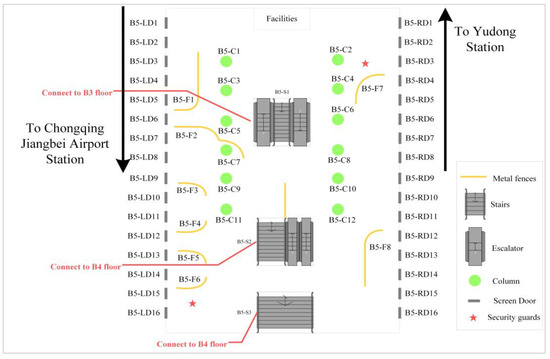 Through detailed field investigations, the layout plans of each floor were drawn. The screen doors, stairs/escalators, metal fences, and the columns are passenger aggregation nodes and were coded in the layout plans. For example, the screen doors in the left side of B5 floor were coded as B5–LD1, B5–LD2…, and the stairs/escalators, the metal fences, the columns in B5 floor were coded as B5–Sxx, B5–Fxx, and B5–Cxx, respectively. The layout plan of B5 floor is shown in Figure 3. The layout plans of the B3 floor and B4 floor are shown in Figure A1 and Figure A2. Besides, the dimensional data of the three floors, including length, width, and area, were measured and are shown in Table 2. (Appendix A).